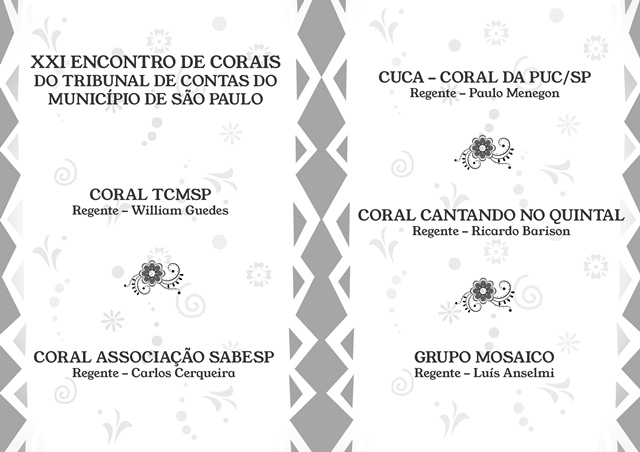 Além da apresentação do Coral do TCMSP, sob a regência de William Guedes, foram convidados o Coral da Associação Sabesp, com a regência de Carlos Cerqueira; o Cuca - Coral da Pontifícia Universidade Católica de São Paulo (PUC-SP), sob a regência de Paulo Menegon; Coral Cantando no Quintal, e seu regente Ricardo Barison; e o Grupo Mosaico, com a regência de Luís Anselmi.
