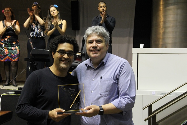 O maestro Carlos Cerqueira, do Coral Associação Sabesp, recebeu homenagem do coralista José Augusto Reguera