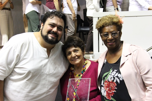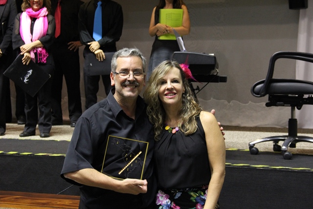 O maestro Ricardo Barison recebeu homenagem da coralista e presidente da ASTCOM, Vera Carrion