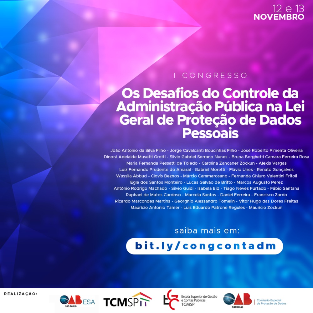 A Escola Superior de Advocacia da OABSP, a Comissão Especial de Proteção de Dados (OAB NACIONAL), está realizando em parceira com o Tribunal de Contas do Município de São Paulo (TCMSP) e a Escola Superior de Gestãoe Contas Públicas do TCMSP o I Congresso: “Os Desafios do Controle da Administração Pública na Lei Geral de Proteção de Dados Pessoais” (LGPDP), de 12 a 13 de novembro, das 9h às 17h, em ambiente virtual Google.