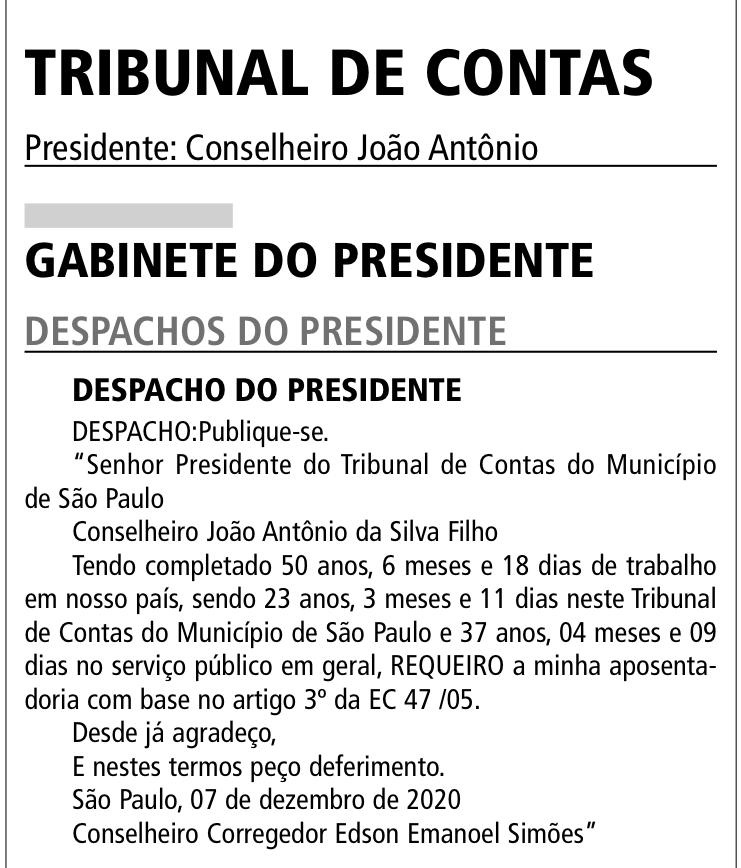 TC 15907/2020 - DESPACHO: “À vista dos elementos de instrução carreados aos autos e das manifestações dos órgãos técnicos da Subsecretaria Administrativa, dos pareceres da Assessoria Jurídica de Controle Externo e da Secretaria Geral, que acolho como razões de decidir: APOSENTO o Excelentíssimo Senhor EDSON EMANOEL SIMÕES, com os direitos e vantagens inerentes ao cargo de Conselheiro do Tribunal de Contas do Município de São Paulo, com fundamento no artigo 3º da Emenda Constitucional nº 47, de 5 de julho de 2005, c.c. o inciso VI, do artigo 93 da Constituição da República Federativa do Brasil, de 5 de outubro de 1988, com as alterações introduzidas pela Emenda Constitucional nº 20, de 15 de dezembro de 1998, no artigo 151, parágrafo único e artigo 31, § 3º da Constituição do Estado de São Paulo de 1989, com efeitos a serem produzidos a partir da data da publicação. Expeça-se o competente título e adotem-se as medidas cabíveis, observadas as cautelas de estilo.”