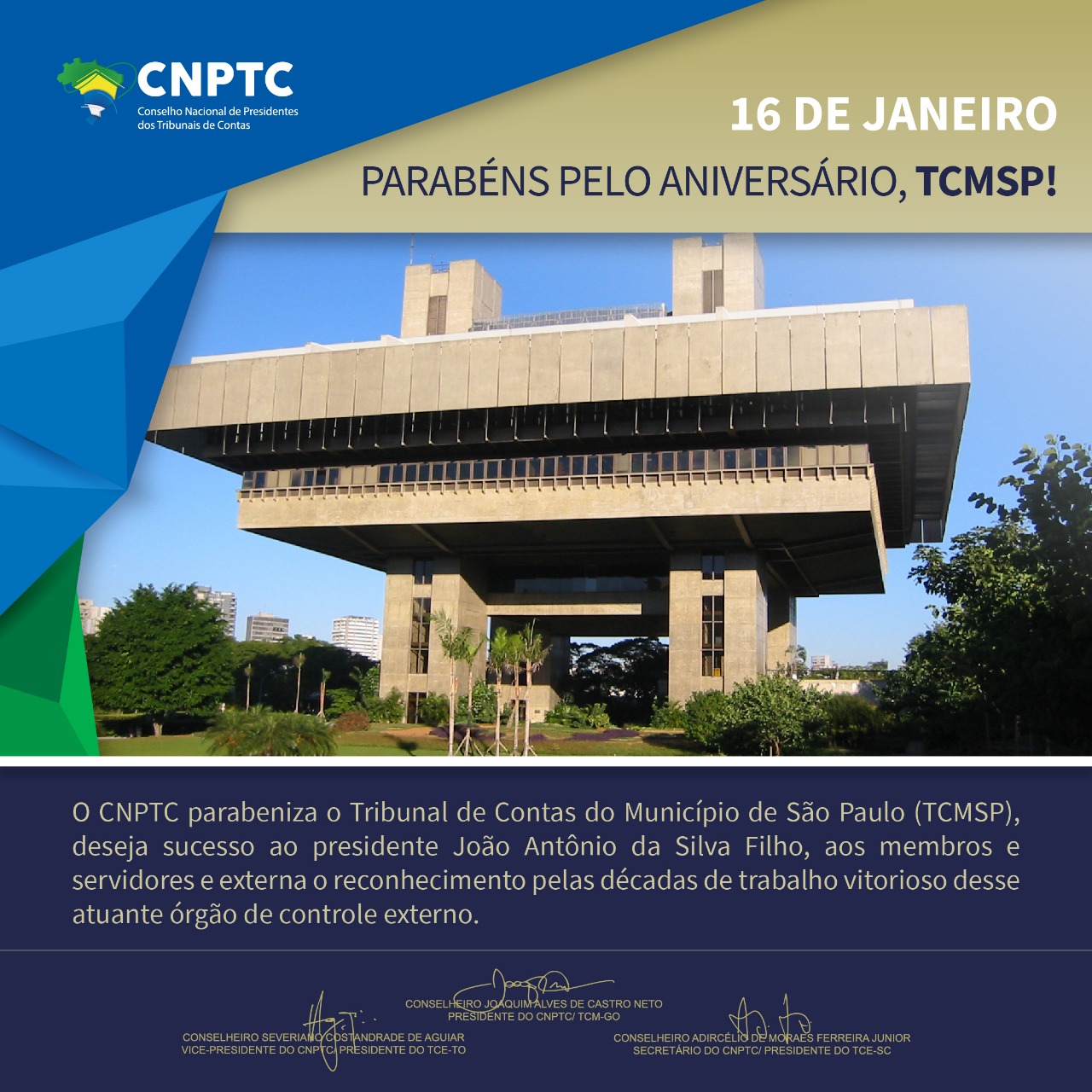 O Conselho Nacional de Presidentes dos Tribunais de Contas (CNPTC) parabenizou o Tribunal de Contas do Município de São Paulo (TCMSP) pelos 52 anos de vida da instituição, completados em 16 de janeiro. Em sua mensagem, os conselheiros Joaquim Alves de Castro Neto, presidente do Conselho, Severiano Costa Andrade de Aguiar, vice-presidente, e Adircélio de Moraes Ferreira Júnior, desejaram ao presidente do TCMSP, conselheiro João Antonio da Silva Filho, e aos membros e servidores do Tribunal sucesso em sua missão e externaram seu reconhecimento “pelas décadas de trabalho vitorioso desse atuante órgão de controle externo”.