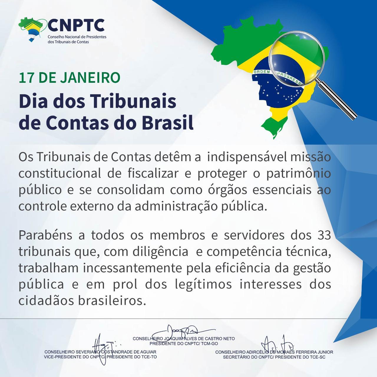 Dia dos Tribunais de Contas do Brasil - O CNPTC também homenageou os 33 TCs (Tribunais de Contas) existentes no país pelo Dia dos Tribunais de Contas do Brasil, celebrado em 17 de janeiro. Em outra mensagem enviada aos órgãos de controle, os dirigentes do Conselho ressaltaram que os TCs detêm a “indispensável missão constitucional de fiscalizar e proteger o patrimônio público e se consolidam como órgãos essenciais ao controle externo da administração pública”.