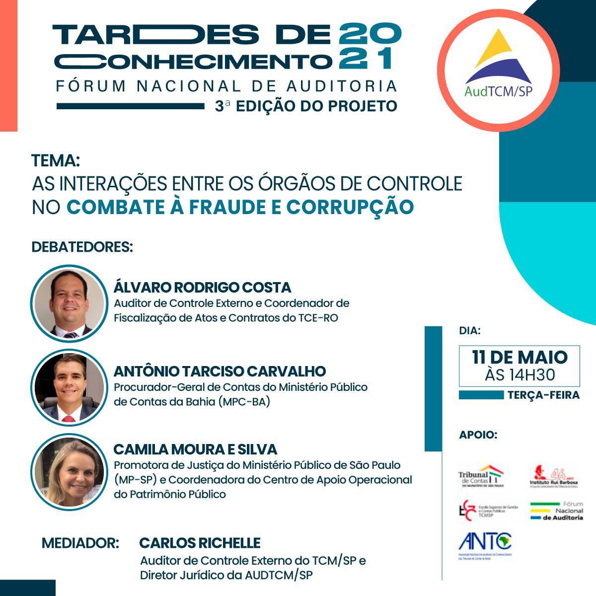 Essa terceira edição do projeto contará com a participação dos debatedores Álvaro Rodrigo Costa, Auditor de Controle externo (TCE-RO); Antônio Tarciso Carvalho, Procurador Geral de Contas (MPC-BA), e Camila Moura e Silva, Promotora de Justiça (MP-SP).