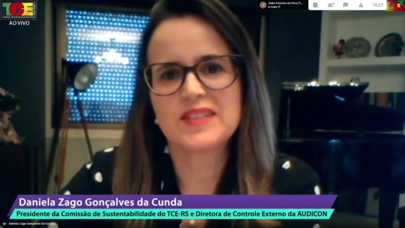 Em sua fala, a Presidente da Comissão de Sustentabilidade do TCE-RS e Diretora da AUDICON, Daniela Zago, ressaltou que o Tribunal se empenha no alinhamemto à vertente ambiental e ecológica. “A comissão está diretamente interligada aos ODS da Agenda 2030 da ONU, sob uma perspectiva mais ampla, o TCE gaúcho desenvolve alguns ODS, já mencionados pelo conselheiro-presidente Estilac Xavier”.
