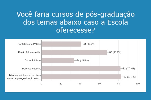 Gilson Piqueras Garcia conta que dentro das novas opções de cursos de especialização oferecidos para verificação de interesse 37,3% dos servidores que responderam o levantamento disseram que fariam o de políticas públicas, 30,9% o de Direito Administrativo, 18,6% o de contabilidade pública e 15,5% o de obras públicas.