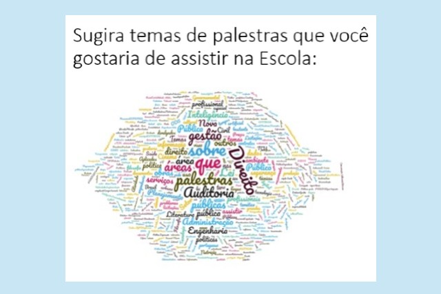 A enquete também abriu espaço para sugestões de temas para cursos, palestras e eventos a serem inseridos na programação da instituição. Para melhor visualização das respostas foi criada uma nuvem de palavras, bastante utilizada para análise de dados, em que os temas mais abordados na pesquisa foram exibidos em tamanhos variados, indicando a relevância e frequência em que foram mencionados pelos servidores. A palavra de maior destaque e tamanho, dentro das sugestões para palestras (114 respostas), foi “Direito”, seguida de “gestão”, “auditoria”, “engenharia” e “licitações”.